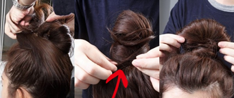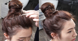將馬尾往上纏繞於半丸子上,收乾淨後, 使用U型夾固定於收尾處, 若要固定得更牢, 也可以在丸子周圍再使用數個U型夾。 若想要更蓬鬆的丸子, 也可以稍微將髮髻拉鬆, 切記千萬別拉過頭反而收不回來。 |